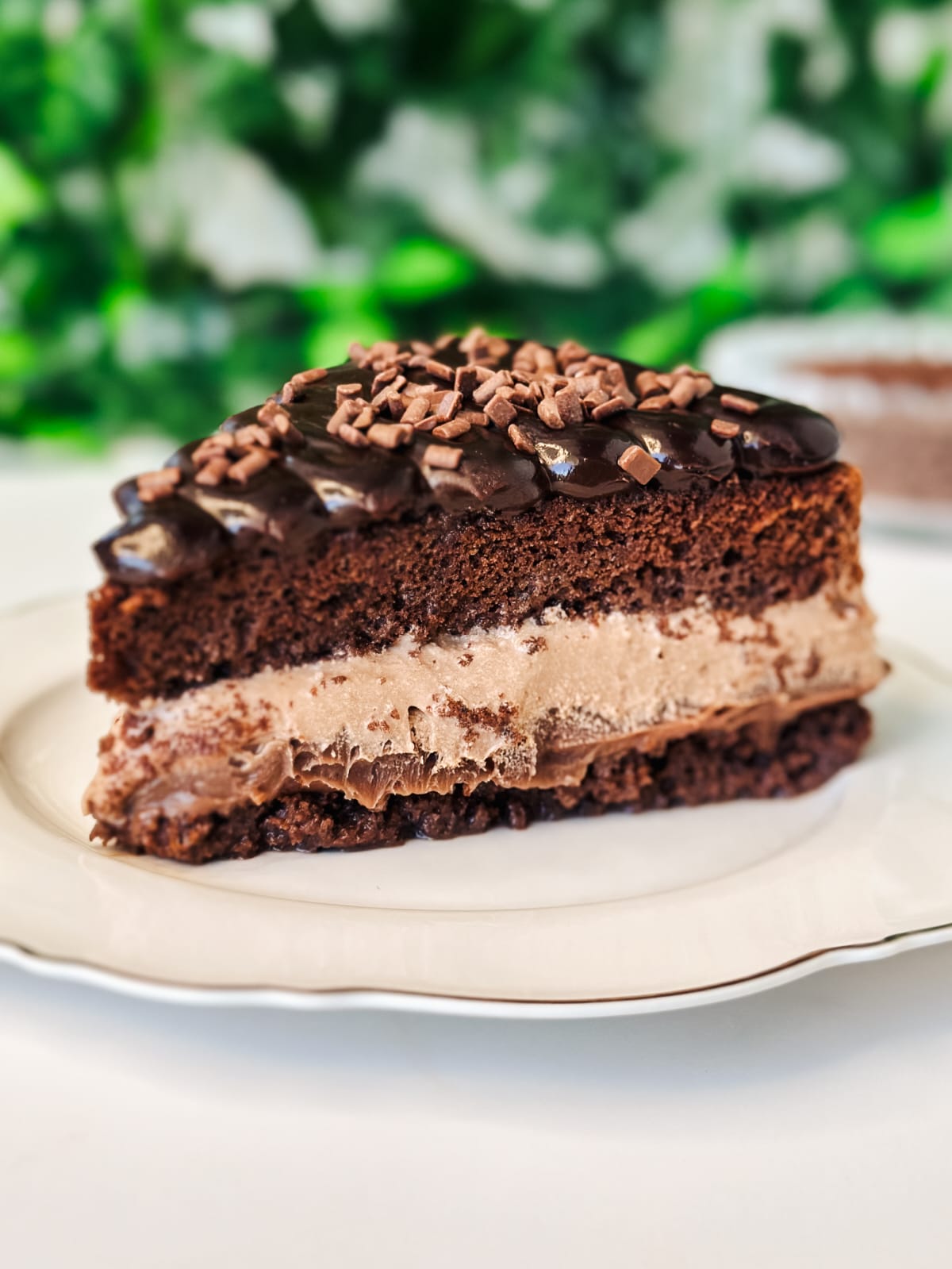 Massa de chocolate, brigadeiro de chocolate ao leite, mousse de chocolate e cobertura de chocolate meio amargo.